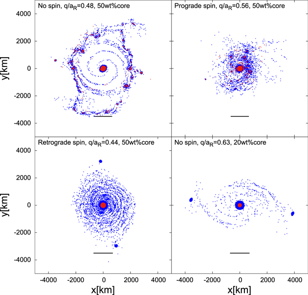 Simulazione del comportamento di un centauro a differenti condizioni di velocità di rotazione e di composizione del nucleo a seguito di un passaggio ravvicinato a un pianeta gigante. Crediti: Ryuki Hyodo, Sébastien Charnoz et altera.