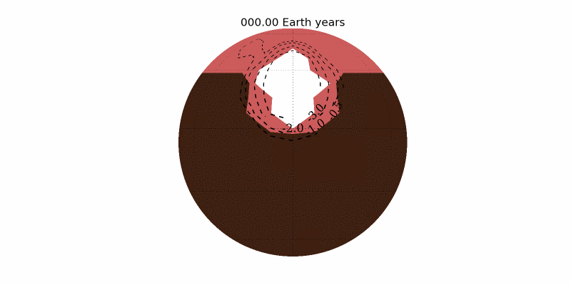 Una mappa animata della superficie di Plutone. Sebbene la maggior parte del serbatoio di metano ghiacciato è improgionato di un bacino profondo 3 chilometri, ogni anno il metano ghiacciato (rosso) appare in autunno e scompare in primavera. Crediti: T. Bertrand