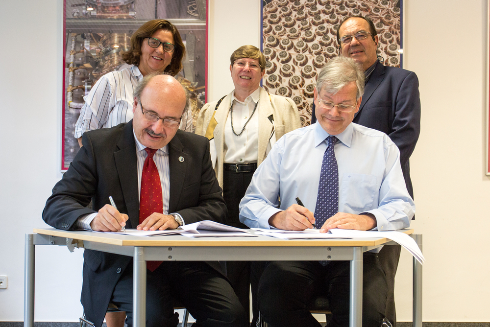 Rafael Rebolo (a sinistra), direttore dello IAC, e Ulrich Straumann (a destra), Managing Director di CTAO gGmbH, firmano l’accordo sul sito dove sorgerà la sezione dell’emisfero nord di CTA. Dietro di loro, da sinistra: Inmaculada Figuero (MINECO), Beatrix Vierkorn-Rudolf (Vice Chair del CTA Council) e Giampaolo Vettolani (Chair del CTA Council). Crediti: CTA Collaboration
