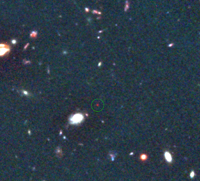 Evidenziata dal cerchio verde, quasi al centro dell’immagine, la galassia più lontana osservata nella campagna di Pentericci e colleghi: COSMOS 13679. Qui una combinazione di immagini in diversi colori (ottici e infrarossi) raccolte con il telescopio spaziale Hubble. Crediti: Pentericci et al. 2016