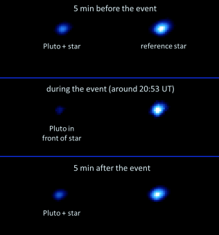 Ed eccoci al 19 luglio 2016, quando Plutone è transitato di fronte a una debole stella nella costellazione del Sagittario, occultandone la luce per un paio di minuti. Man mano che il pianeta nano si sposta in cielo, attenua gradualmente la luce della stella retrostante, rivelando informazioni preziose sulla sua atmosfera ai telescopi che la osservano.