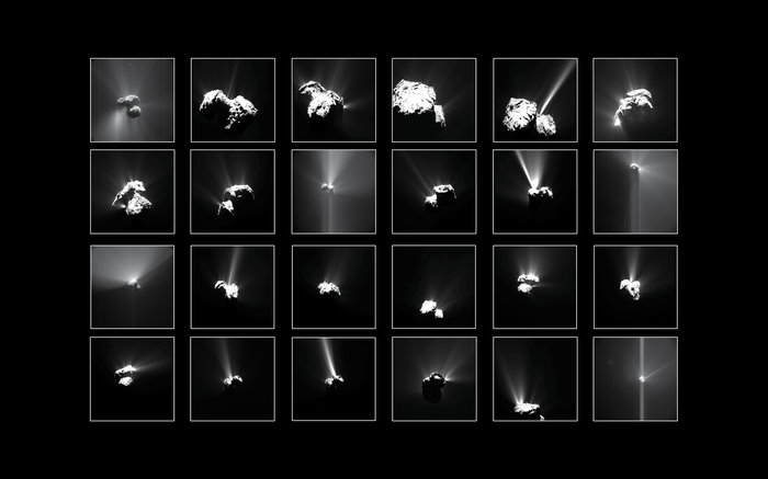 La compilazione delle fuoriuscite di materiale più brillanti viste sulla cometa 67P / Churyumov-Gerasimenko dalla camera OSIRIS e dalla Navigation Camera di Rosetta tra luglio e settembre 2015. Crediti: OSIRIS: ESA/Rosetta/MPS for OSIRIS Team MPS/UPD/LAM/IAA/SSO/INTA/UPM/DASP/IDA; NavCam: ESA/Rosetta/NavCam – CC BY-SA IGO 3.0