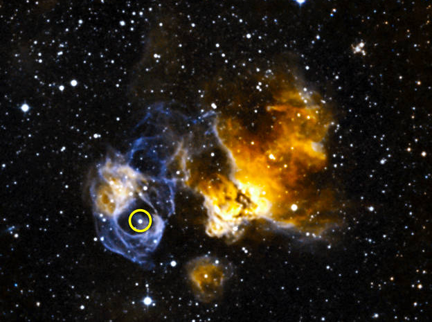 Si trova nella Grande Nube di Magellano, una piccola – a dispetto del nome – galassia nella periferia della Via Lattea, a circa 163 mila anni luce di distanza da noi. Ed è situato (vedi il circoletto giallo nell’immagine di apertura) nel cuore di una nube in espansione di residui dell’esplosione di una supernova.