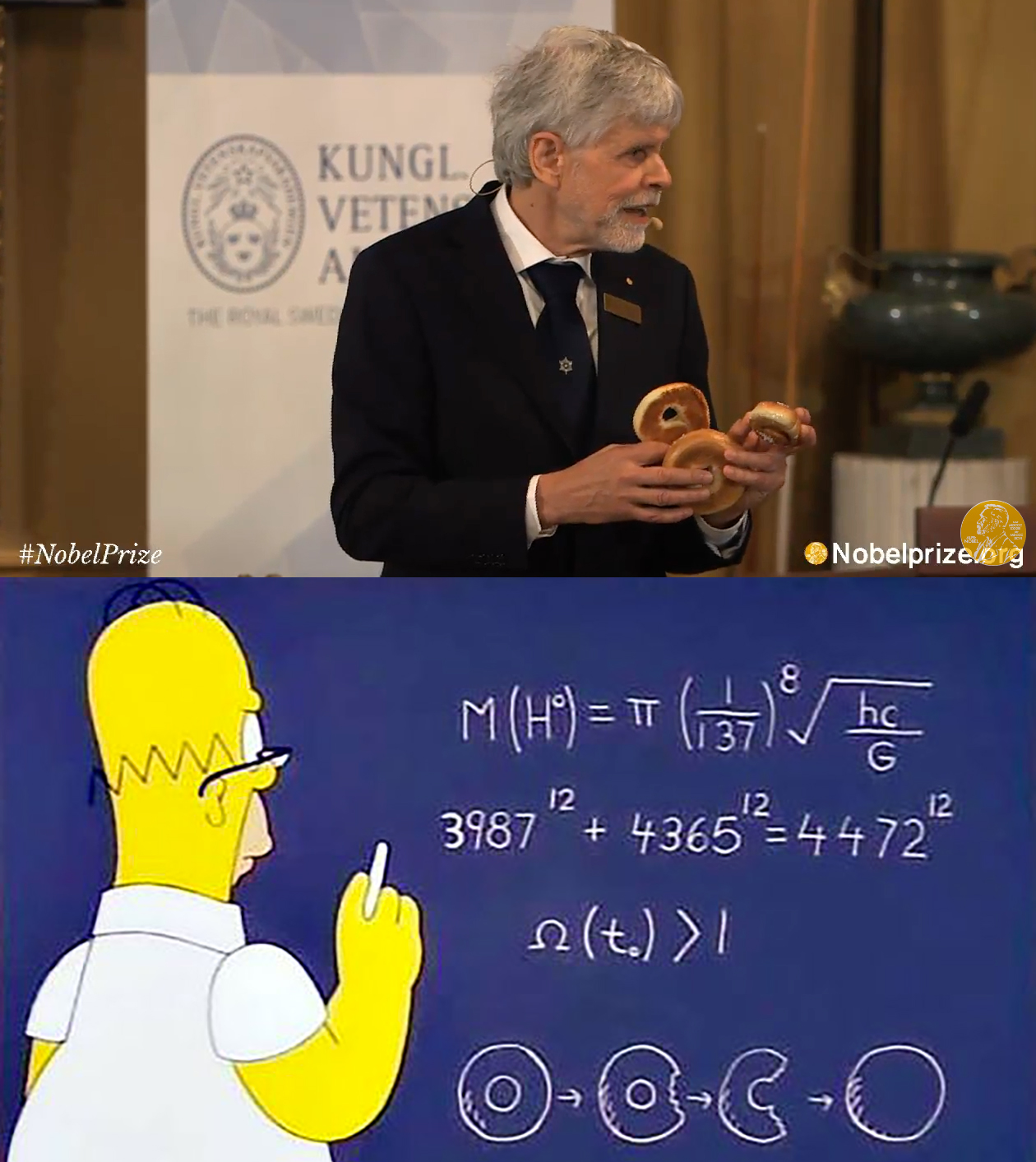 Ora, che topologia e bagel siano intimamente connessi è abbastanza risaputo (grazie soprattutto a Homer Simpson). E se non fosse sufficiente a comprendere la ragione di questa scelta, è stato garantito durante la diretta dell’annuncio che le scoperte dei tre premiati potranno avere applicazioni nel campo della computazione quantistica topologica. Ancora non ci basta? E allora, in attesa di poter approfondire, consoliamoci, come è stato detto durante la premiazione, pensando all’eleganza: alla bella matematica e alle profonde intuizioni fisiche che stanno alla base delle teorie di Thouless, Haldane e Kosterlitz. Un premio alla bellezza, insomma.