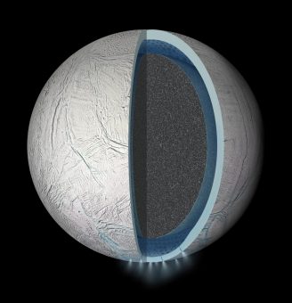 Rappresentazione dell’interno di Encelado con crosta ghiacciata, oceano e nucleo solido. Al polo sud sono presenti geyser. Crediti: NASA/JPL-Caltech/Space Science Institute