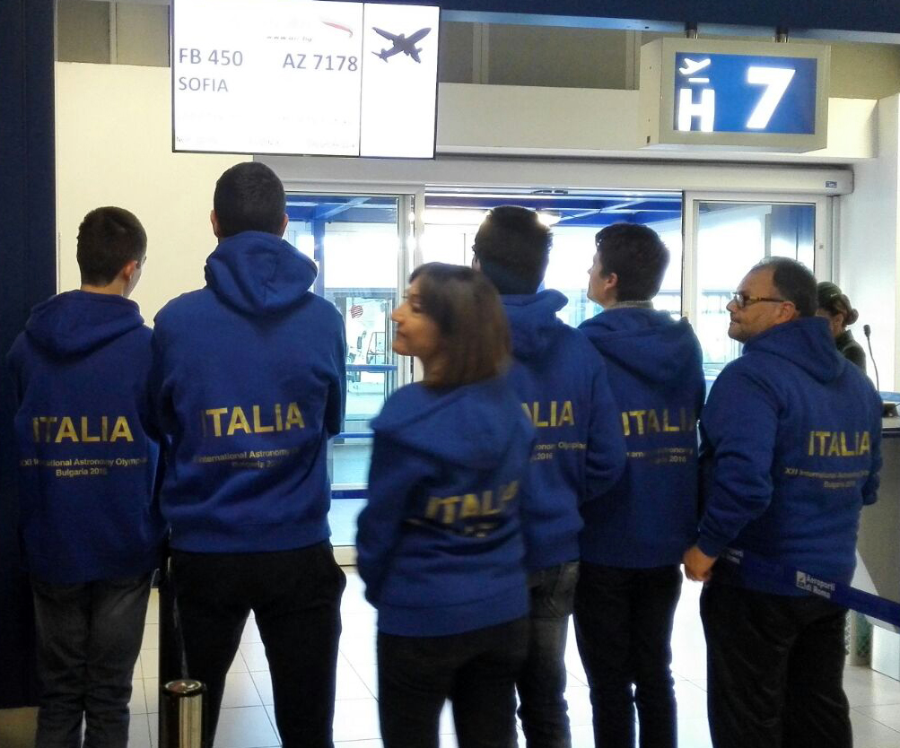 La squadra italiana (vedi foto) è il risultato di una severa selezione tenutasi in ogni regione durante lo scorso anno scolastico e i suoi componenti sono i vincitori della Finale nazionale 2016 svoltasi a Milano lo scorso mese di aprile presso l’I.I.S. Statale “L. Cremona”. La squadra è formata da 6 studenti, tre per la categoria senior e tre per la categoria junior. A caccia di una medaglia saranno Pietro Benotto (I.I.S.S. “G. Vallauri” di Fossano – CN), Jacopo Guoyi Chen (Liceo Scientifico Statale “A. Landi” di Velletri – RM) e Flavio Salvati (Liceo Scientifico Statale “Leonardo da Vinci” di Fiumicino – RM) per i senior, mentre il terzetto junior è formato  da Lorenzo Pica Ciamarra (Liceo Classico Statale “Vittorio Emanuele II” di Napoli), Augusto Giuseppe Suraci (Liceo Scientifico Statale “Leonardo da Vinci” di Reggio Calabria) e da Vincenzo Sorrentino (Liceo Scientifico “M. Guerrisi” di Cittanova  – RC), il più giovane (compirà 15 anni a dicembre) del gruppo. Ad accompagnare i ragazzi ci siamo io (Maria Pia Di Mauro, dell’INAF – Istituto di Astrofisica e Planetologia Spaziali di Roma), in qualità di team leader, e Gaetano Valentini (INAF – Osservatorio Astronomico di Teramo), che farà parte della giuria internazionale.