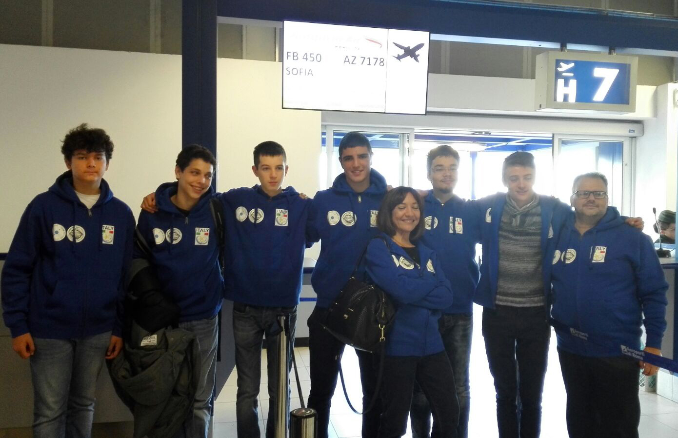Il team in partenza, al gate per il volo verso Sofia. Da sinistra: Vincenzo Sorrentino, Lorenzo Pica Ciamarra, Pietro Benotto, Augusto Giuseppe Suraci, Maria Pia Di Mauro, Jacopo Guoyi Chen, Flavio Salvati, Gaetano Valentini.