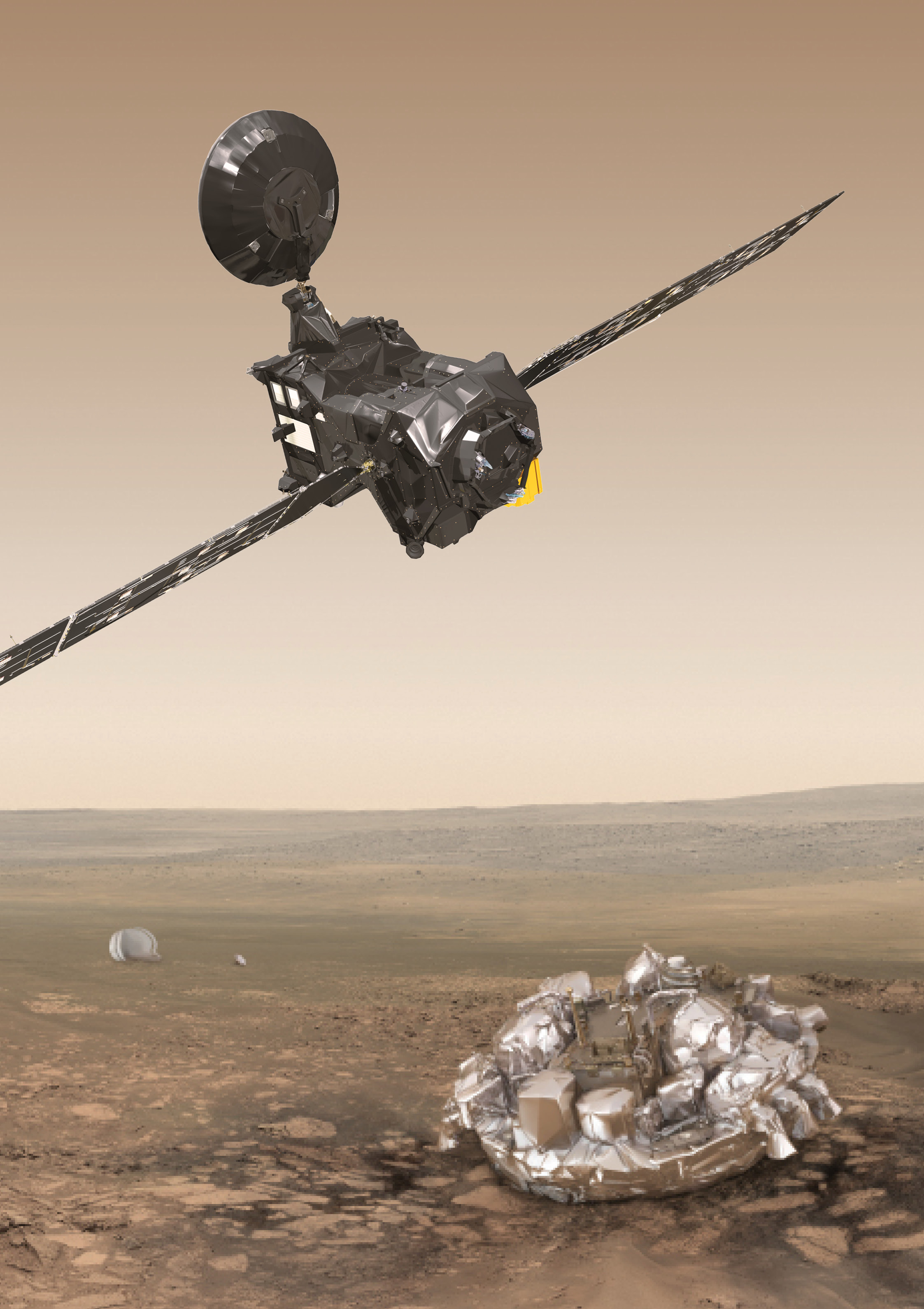 Rappresentazione artistica del Trace Gas Orbiter (TGO, in alto a sinistra) e del modulo Schiaparelli (in basso a destra), che compongono la missione ExoMars 2016. Il modulo Schiaparelli è rappresentato nella sua configurazione di superficie, dopo il distacco dei suoi scudi termici e paracadute ( visibili sullo sfondo) durante la discesa nell’atmosfera marziana. Il TGO e Schiaparelli non sono rappresentati in scala. Crediti: ESA/ATG medialab
