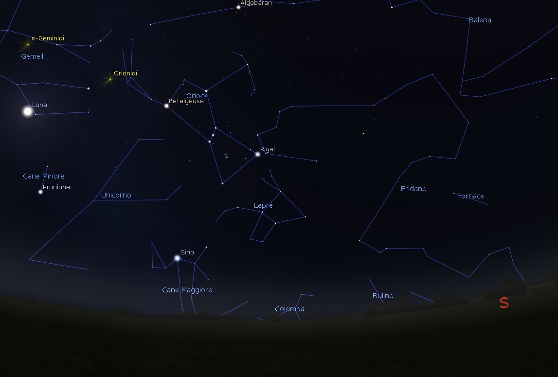 Simulazione del cielo visibile in direzione sud est il 22 ottobre alle 2 antimeridiane, per le latitudini dell’Italia centrale. Si noti la presenza della Luna in vicinanza della costellazione di Orione da cui sembrano irradiarsi le meteore di questo sciame. Crediti: Media INAF – Stellarium