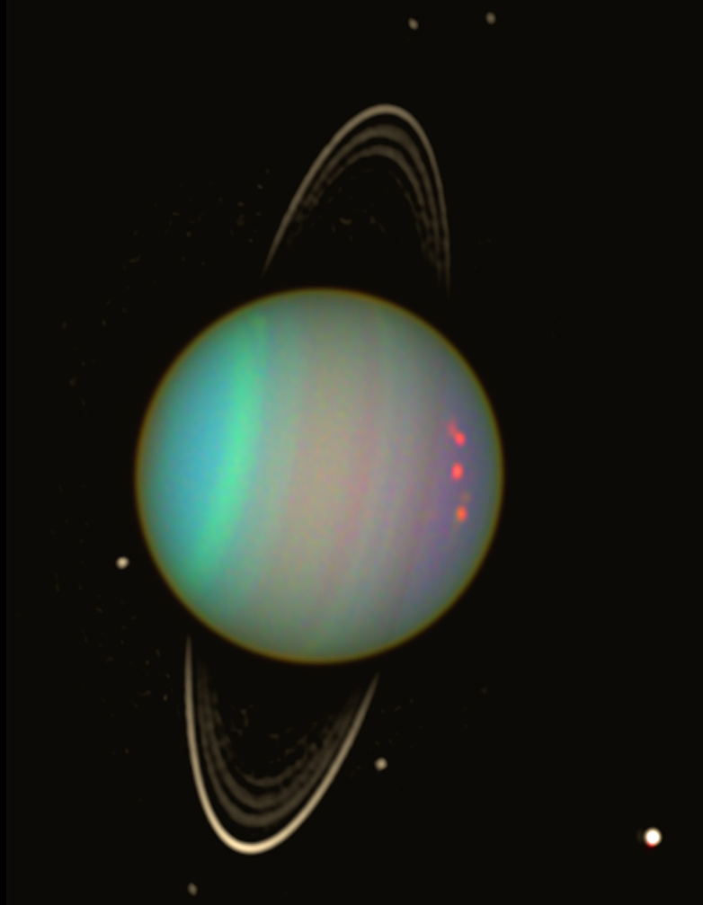 Urano a falsi colori visto dal telescopio spaziale Hubble della NASA nell’agosto 2003. La luminosità dei fiochi anelli del pianeta e delle sue lune scure è stata esaltata per migliorarne la visibilità. Crediti: NASA / Erich Karkoschka (Univ. Arizona)