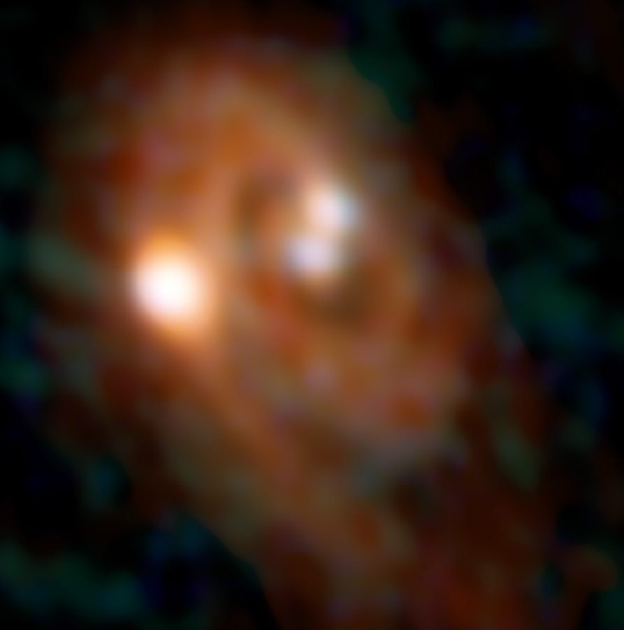 Immagine VLA del sistema protostellare triplo L1448 IRS3B ottenuta alla lunghezza d’onda di 8 mm, dove risaltano maggiormente rispetto a quella ALMA le singole protostelle. Crediti: John Tobin, VLA