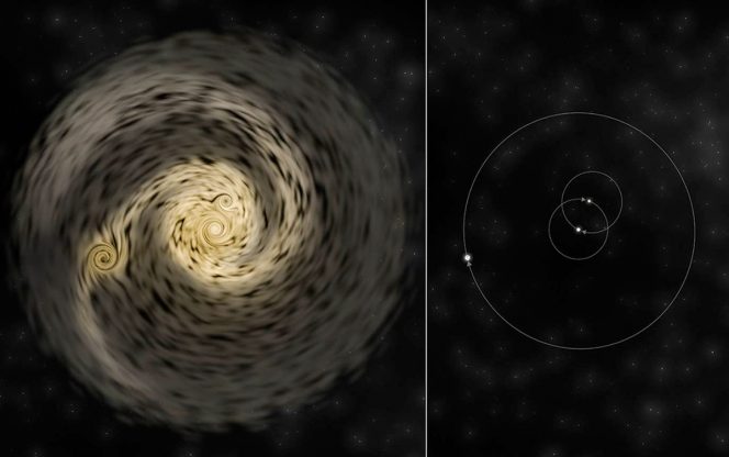 Illustrazione di come si sviluppa un sistema stellare triplo. A sinistra, un singolo disco originario di materiale si frammenta in protostelle separate; a destra, il risultante sistema stellare. Credit: Bill Saxton, NRAO/AUI/NSF.