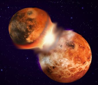 Illustrazione dell’ipotesi dell’impatto gigante. Un corpo celeste delle dimensioni di Marte colpì la primitiva Terra dalla cui collisione avrebbe avuto origine la Luna. Crediti: Hagai Perets