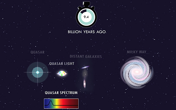 Osservata la luce di un quasar a 8.5 miliardi di anni luce dopo il suo passaggio attraverso galassie distanti. Crediti: James Josephides e Michael Murphy
