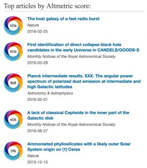 I cinque paper con punteggio Altmetric più elevato fra quelli con autori Inaf dal 1/9/2015 al 31/8/2016