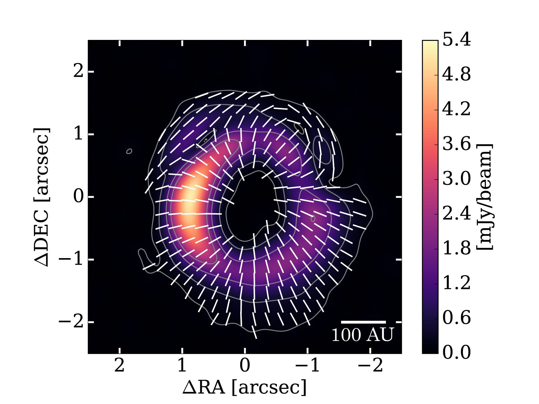 Il modello di polarizzazione ottenuto con ALMA attorno alla giovane stella HD 142527. I contorni mostrano l’intensità totale delle emissioni di polveri e l’immagine a colori mostra l’intensità delle emissioni polarizzate. Le barre bianche indicano la direzione di polarizzazione. Crediti: ALMA (ESO / NAOJ / NRAO), Kataoka et al.