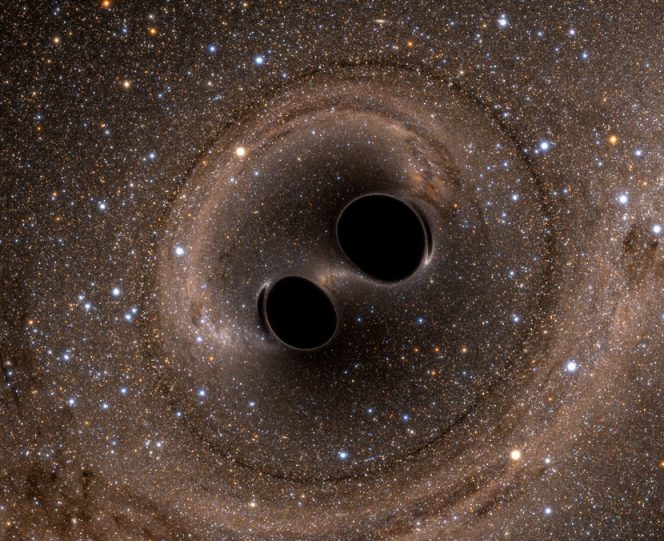 Rappresentazione artistica dei due buchi neri all’origine delle onde gravitazionali rivelate da LIGO. Crediti: SXS Lensing
