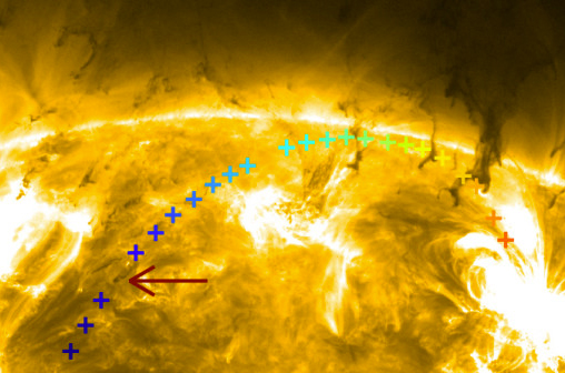 Le croci questa immagine SDO / AIA in segnano il percorso di plasma nel bagliore del giugno 2011, provocato da una eruzione di plasma ricaduto poi sulla superficie del Sole. Tali eventi consentono di studiare il campo magnetico e come questo interagisce con il plasma. [Petralia et al. 2016]