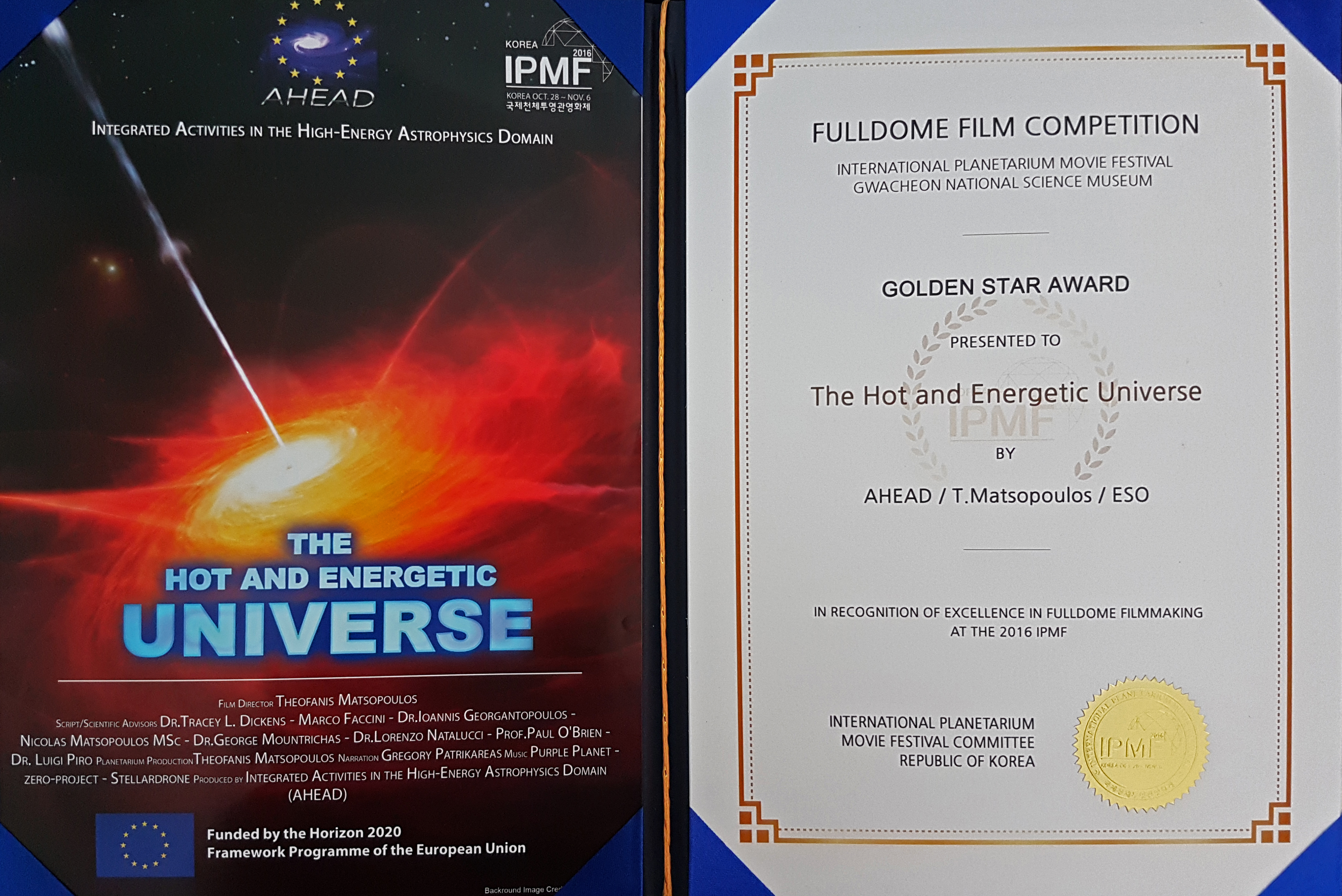 S’intitola L’Universo caldo e violento (The Hot and Energetic Universe). È un documentario per planetari prodotto nell’ambito del progetto europeo AHEAD (Integrated Activities in the High-Energy Astrophysics Domain). Era stato selezionato fra i dieci film ammessi al Festival Internazionale del Cinema per planetari IPMF, che si è tenuto nella Repubblica di Corea. E, alla fine, è risultato quello vincitore, aggiudicandosi il Golden Star Award 2016.