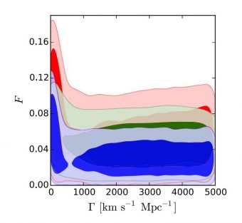 La figura illustra la percentuale della componente instabile della materia oscura (F) in funzione del tasso di espansione delle strutture non legate gravitazionalmente, proporzionale all’età dell’universo, quando vengono esaminate varie combinazioni dei dati di Planck per diversi fenomeni cosmologici. Crediti: MIPT Press Office