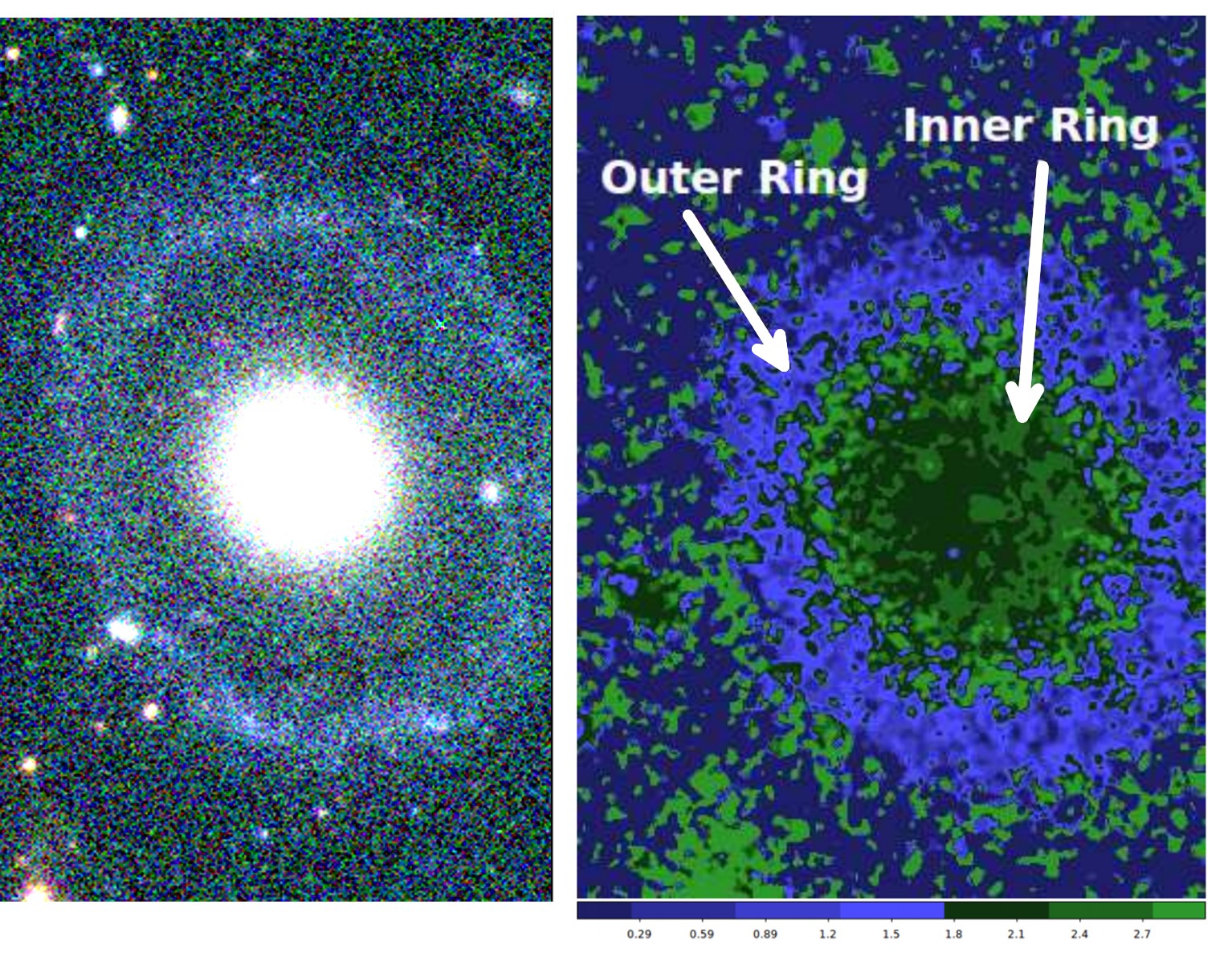 A sinistra, l’immagine in falsi colori della galassia PGC 1000714. A destra, invece, la mappa realizzata con indice di colore B-I dove si vede sia l’anello più esterno (blu) che quello più diffuso e interno (verde chiaro). Crediti: Ryan Beauchemin