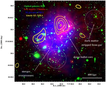 «Le osservazioni di NIKA a 140 GHz e 260 GHz – frequenze possibili da terra perché poco contaminate dall’emissione atmosferica, dovuta prevalentemente al vapor d’acqua, – godendo della alta risoluzione angolare raggiunta, consentita dall’impiego di un telescopio di grandi dimensioni come il 30 metri di IRAM a Pico Veleta in Spagna, hanno permesso di produrre una mappa di segnale kSZ», racconta De Petris. «L’incrocio con i dati in banda X ottenuti dal satellite XMM-Newton, i quali rivelano essenzialmente la temperatura del gas ionizzato presente all’interno dell’ammasso, ha quindi permesso di inferire, con un buon rapporto segnale rumore, le componenti delle velocità di due dei sotto-ammassi presenti all’interno del cluster MACS J0717.5+3745».