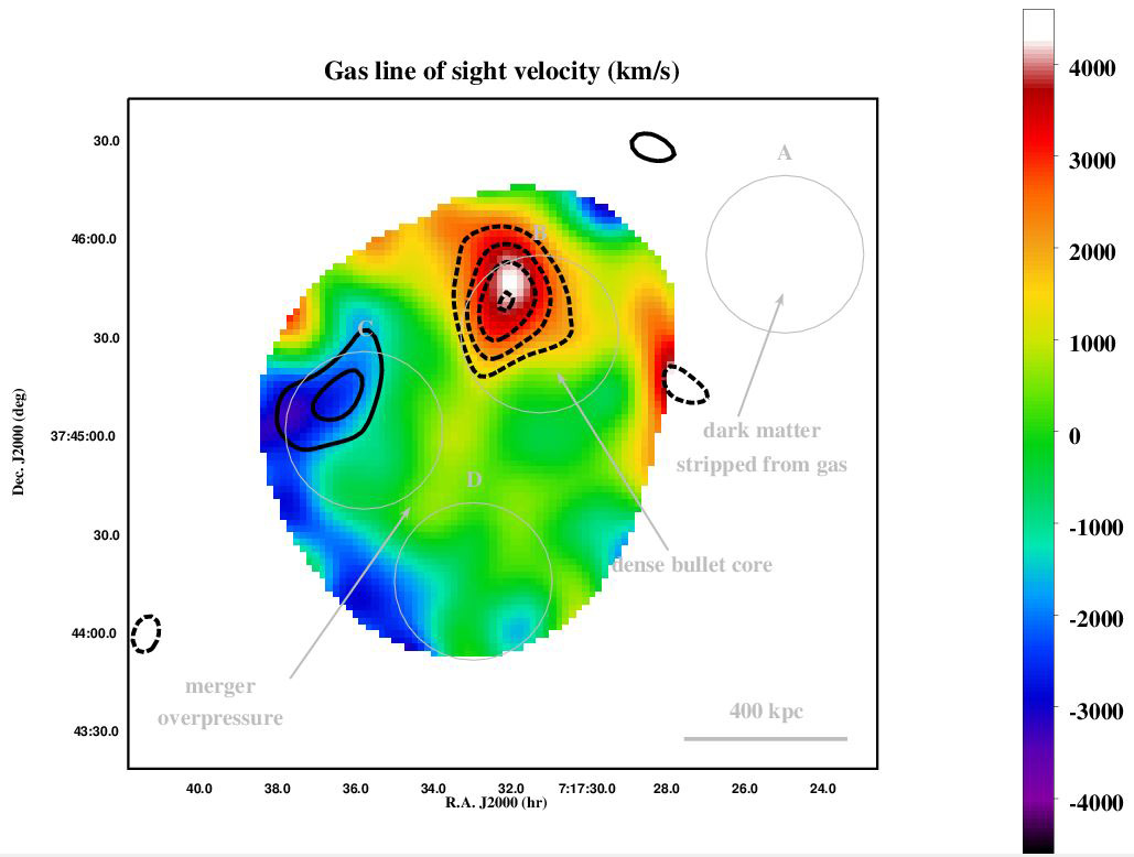 I dati hanno mostrato che i due sotto-ammassi principali (indicati dalle lettere B e C nella figura in apertura) sono sul punto di cadere l’uno sull’altro a gran velocità (vedi figura qui a fianco). «Il semplice rilevamento dell’effetto kSZ è già un grande risultato in sé, ma quando ci siamo resi conto che eravamo in grado di ottenere una mappa, per noi è stato un successo enorme», commenta il primo firmatario del nuovo studio, Rémi Adam del Laboratoire Lagrange – OCA, UCA, LPSC Grenoble, CNES.