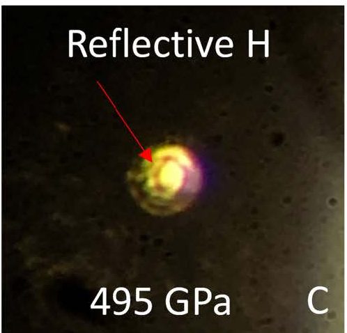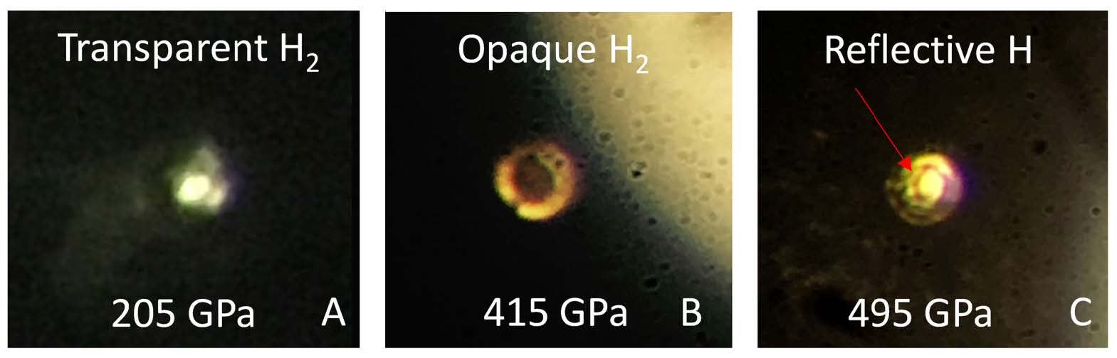 Fotografie della transizione dell’idrogeno compresso, all’aumentare della pressione, da trasparente a nero molecolare a atomico molecolare. Crediti: R. Dias e I.F. Silvera