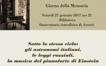 In occasione del Giorno della Memoria, venerdì 27 gennaio alle ore 21 l’Osservatorio astrofisico di Arcetri dell’Inaf, in collaborazione con l’Associazione astronomica Amici di Arcetri, ospiterà un concerto per pianoforte e violoncello eseguito da Giovanni Del Vecchio e Fernando Scarselli, preceduto da un intervento sulle conseguenze delle leggi razziali sull’astronomia italiana a cura di Agnese Mandrino e Antonella Gasperini.