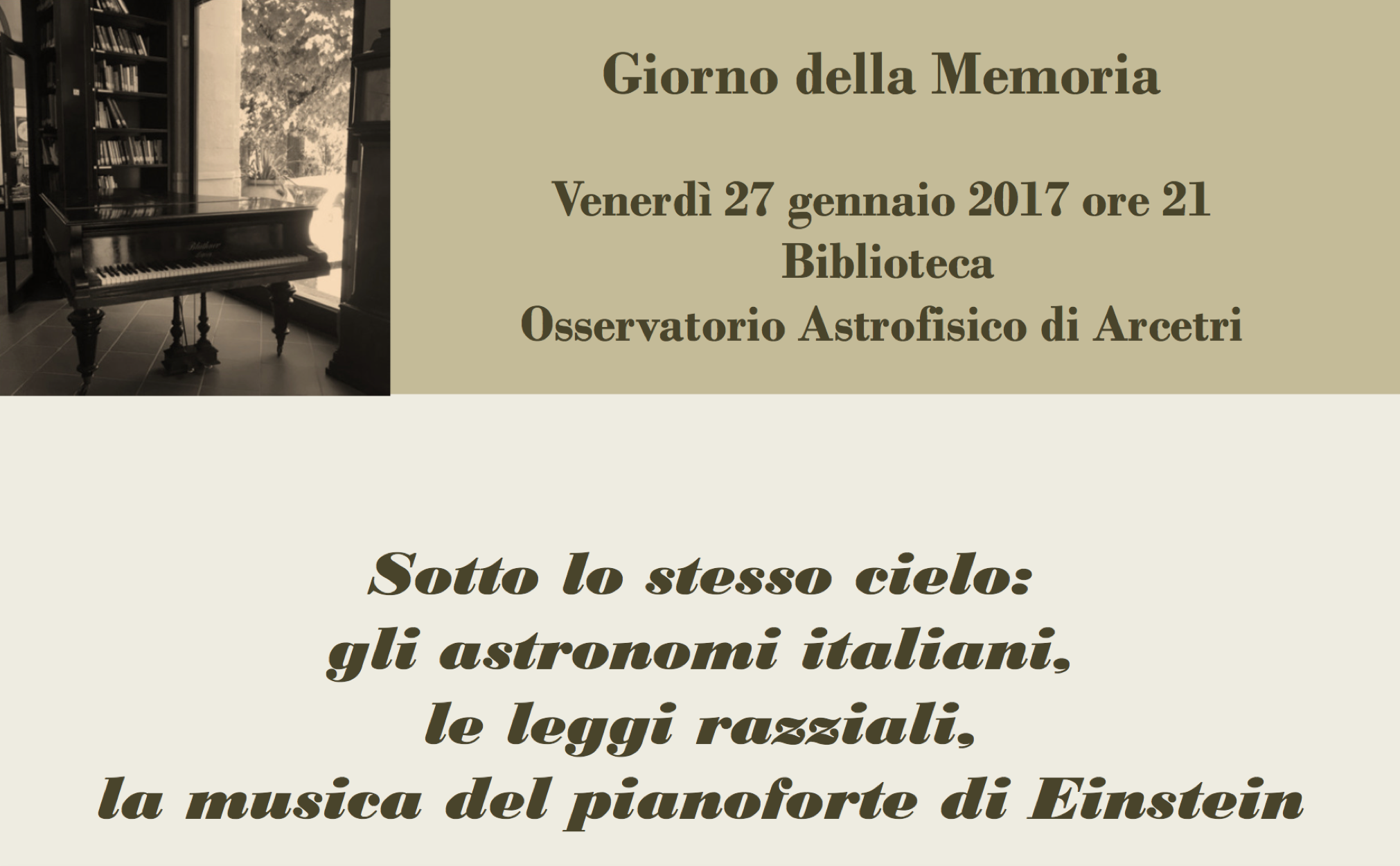 A due anni dalla giornata di studi “Sotto lo stesso cielo?” organizzata da Fabrizio Bonoli e Agnese Mandrino presso la Specola di Bologna, in cui venne presentato per la prima volta il lavoro di ricerca effettuato all’interno degli archivi storici degli Osservatori italiani, saranno ricordati ad Arcetri gli astronomi vittime delle persecuzioni razziali in un contesto particolare: la musica in programma non sarà soltanto tratta da un repertorio consono alla tragicità della ricorrenza, ma soprattutto verrà eseguita sul “pianoforte di Einstein”, uno strumento che è simbolo di per sé della discriminazione razziale rivolta contro la popolazione di religione ebraica.