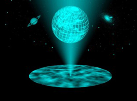 Si può immaginare che tutto ciò che si vede, si sente e si ascolta in 3D – e la percezione del tempo – sia emanazione di un campo piatto bidimensionale, cioè che la terza dimensione sia ‘emergente’, se paragonata alle altre due dimensioni. L’idea, quindi, è simile a quella degli ologrammi ordinari, in cui l’immagine tridimensionale è codificata in una superficie bidimensionale, come nell’ologramma su una carta di credito, solo che qui è l’intero universo a essere codificato. In un ologramma la terza dimensione viene generata dinamicamente a partire dall’informazione sulle rimanenti due dimensioni.