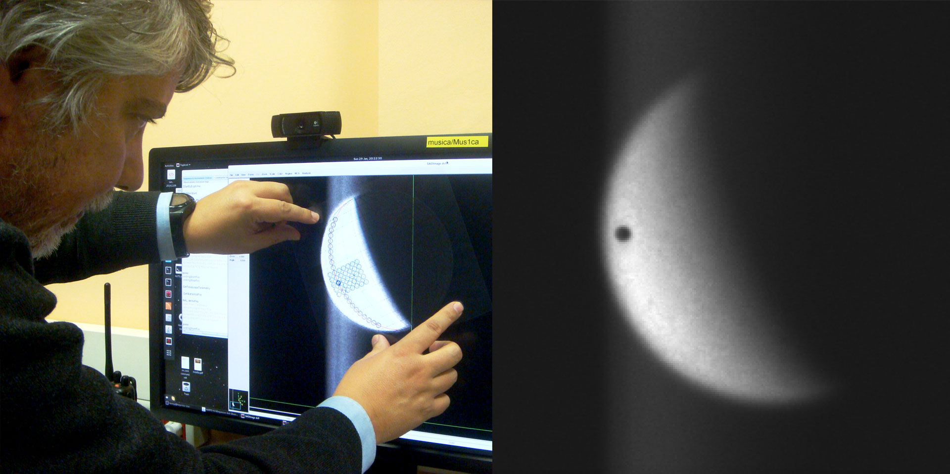 A sx: un disegno su foglio trasparente viene usato come guida per osservare uno specifico punto della superficie di Venere. A dx: il punto nero su Venere è il “buco” della fibra ottica che porta la luce allo spettrografo Harps-N. Crediti: Tng/P.Machado/A.Harutyunyan