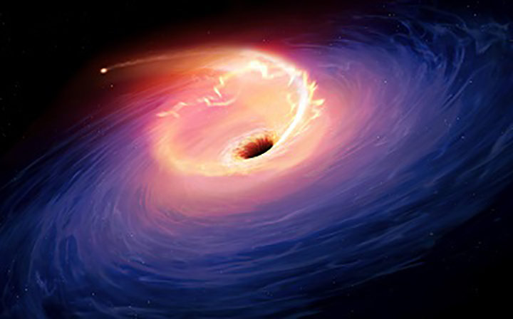 Rappresentazione artistica d’un evento di distruzione mareale nella galassia F01004-2237. Il rilascio di energia gravitazionale prodotto dai detriti della stella che precipitano nel buco nero genera un intenso bagliore. Crediti: Mark Garlick