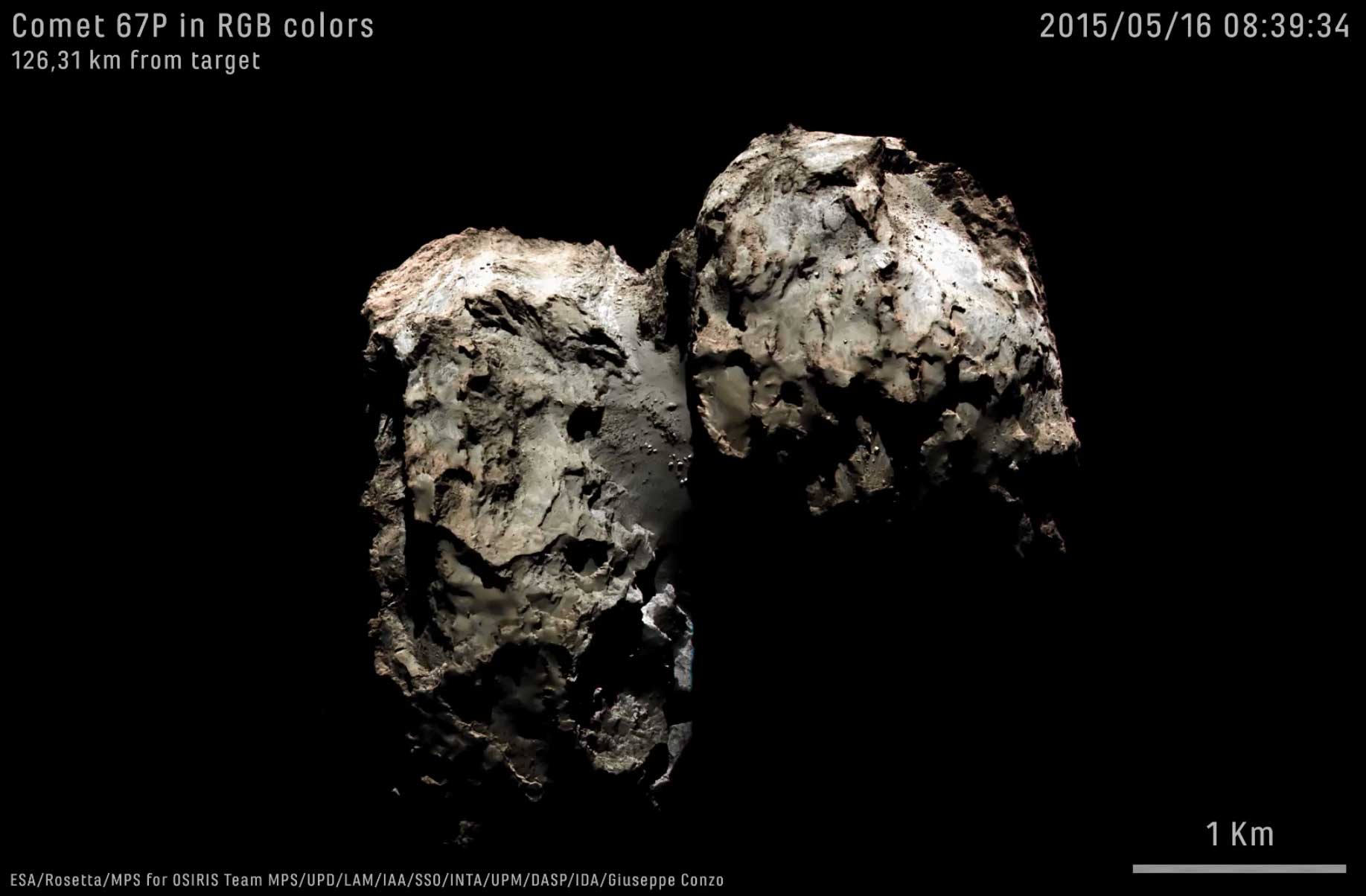 «In questa animazione», spiega lo stesso Giuseppe Conzo, «si nota come la cometa effettui la sua rotazione, la cui durata è di 12,8 ore. Si notano molto bene i colori della cometa che rappresentano colori abbastanza naturali, trattandosi del risultato dell’unione dei canali R (Rosso), G (Verde) e B (Blu), i colori fondamentali dello spettro del visibile. In aggiunta, in sottofondo si sente il “suono della cometa” pubblicato dall’Esa nel 2014». L’animazione mostra anche, per ogni fotogramma, la distanza della sonda dal nucleo e la data e l’ora di acquisizione.
