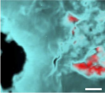 Una mappa di fluorescenza ai raggi x di un campione di whitlockite dopo l’impatto. Il colore rosso indica le concentrazione di merrillite. Crediti: Argonne National Laboratory