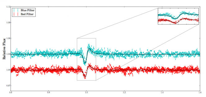 Curva di luce emessa da Iota Orionis in banda rossa (in rosso) e blu (in azzurro). Nell’inserto viene evidenziato il “battito cardiaco” del sistema. Crediti: H. Pablo et al. 2017