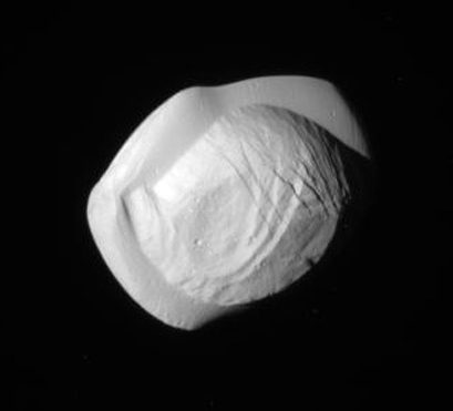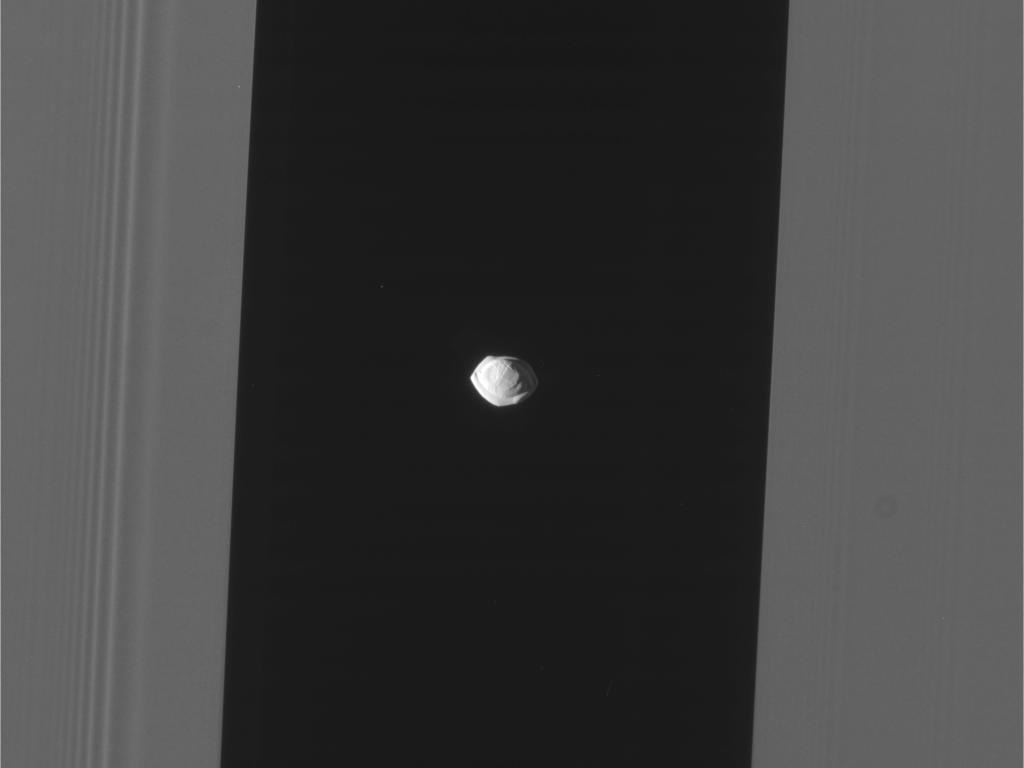 Già si sapeva che Pan, la luna più interna di Saturno, possiede un aspetto bizzarro. Precedenti immagini riprese dalla sonda Cassini lasciavano ben intuire come questo piccolo corpo ghiacciato – 35 per 20 km appena – assomigliasse a un “disco volante”.