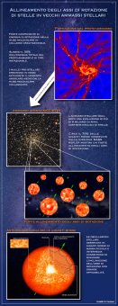 “Ciò che abbiamo osservato, cioè il forte allineamento degli assi di rotazione di un consistente numero di stelle, può essere riprodotto assumendo che almeno la metà del totale di energia cinetica della nube molecolare che ha dato origine a ciascuno dei due ammassi, fosse di carattere rotazionale” aggiunge Corsaro. “Questo ci mostra come il momento angolare globale della nube sia stato trasferito in modo efficiente alle singole stelle che si sono formate al suo interno. Tuttavia ciò non si verifica se le stelle hanno masse più piccole rispetto al Sole poiché dalla nube non viene trasferita massa a sufficienza per contrastare i moti turbolenti, che quindi ridistribuiscono il momento angolare in tutte le direzioni facendo perdere ogni traccia di un possibile allineamento degli assi di rotazione”.
