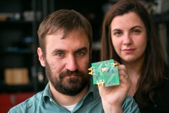 Alyosha Molnar e Hazal Yüksel con il chip ricetrasmittente bidirezionale. Crediti: Cornell University