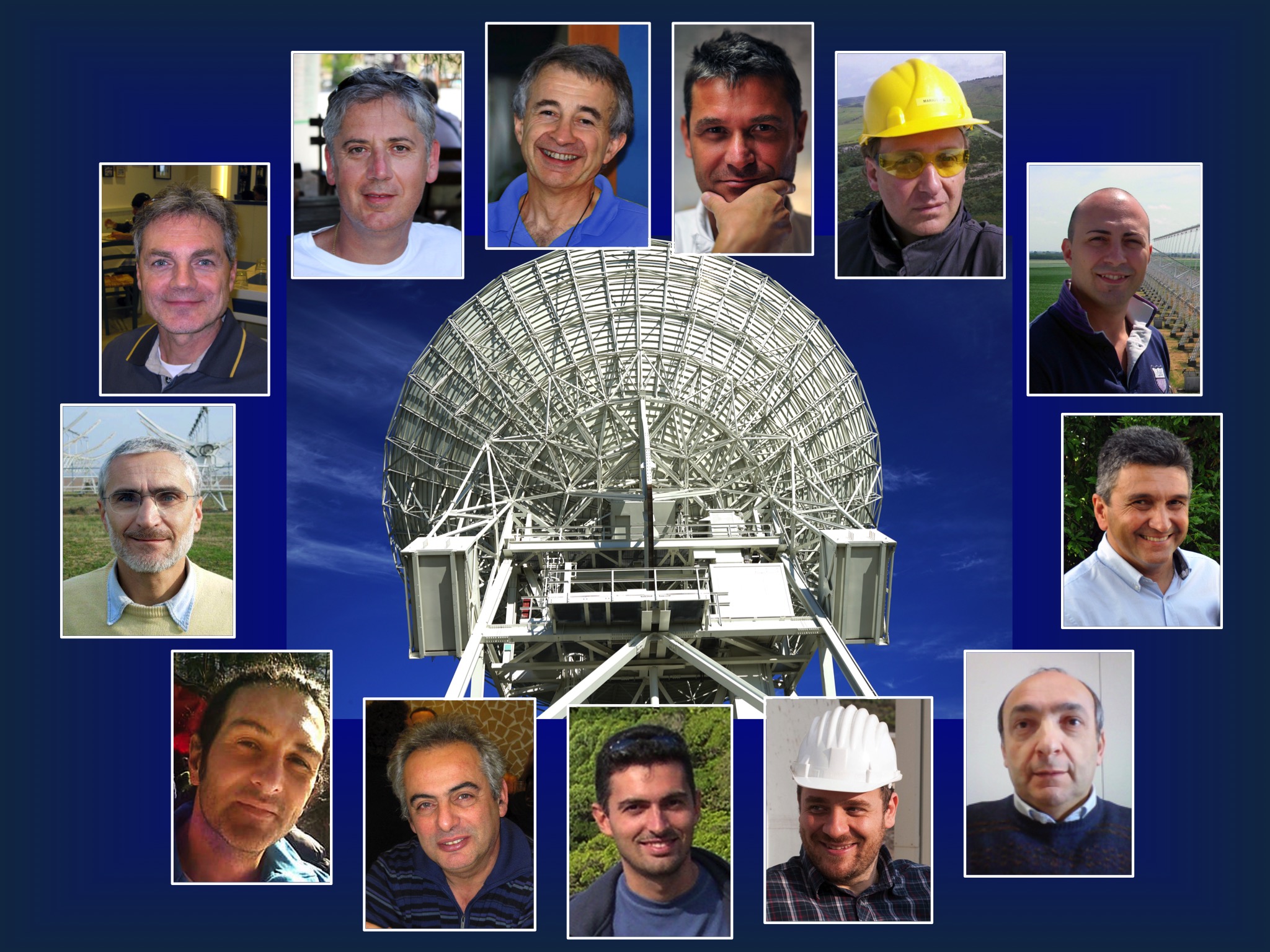 Il team di Medicina che si occupa di Vlbi (cliccare per ingrandire). Dall’alto a destra, in senso orario: Sergio Mariotti (con il casco giallo), Andrea Mattana, Marco Morsiani, Alessandro Orfei, Andrea Orlati (con il casco bianco), Juri Roda, Mauro Roma, Alessandro Scalambra, Gianpaolo Zacchiroli, Claudio Bortolotti, Alessandro Cattani, Andrea Maccaferri e Giuseppe Maccaferri. Nella collaborazione fra Medicina e RadioAstron sono coinvolti anche i ricercatori Marcello Giroletti e Gabriele Giovannini. Crediti: Simona Righini/Inaf