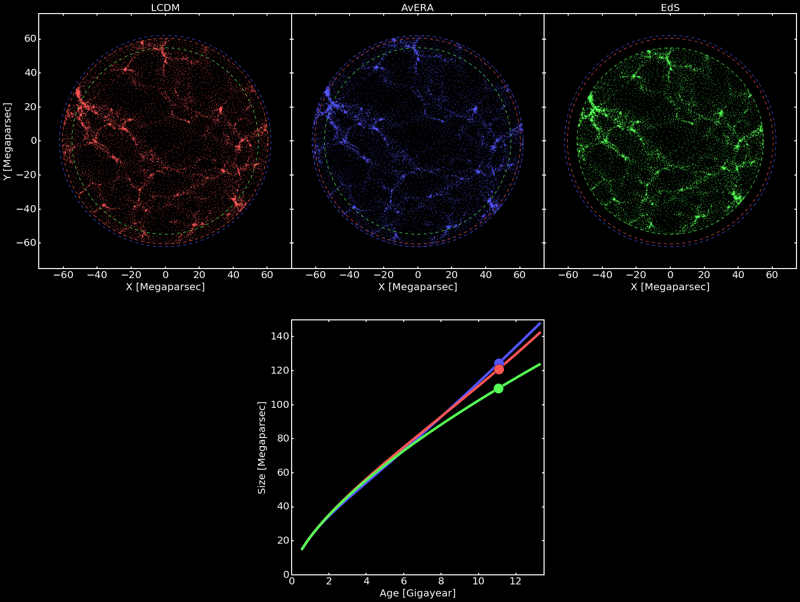 Un fermo immagine di un’animazione che mostra l’espansione dell’universo nel modello cosmologico standard con materia oscura fredda ed energia oscura (pannello in alto a sinistra, colore rosso), con il nuovo modello che considera la struttura globale dell’Universo ed elimina la necessità di energia oscura (pannello centrale, in blu), e il modello Einstein-de Sitter originale senza materia oscura (pannello a destra, in verde). Il pannello in basso mostra l’aumento del fattore di scala in funzione del tempo (1 G year corrisponde a un miliardo di anni). Le unità di scala nei pannelli in alto sono espresse in Megaparsec, dove un Megaparsec corrisponde a circa 3 milioni di anni luce. Clicca sull’immagine per vederla ad alta risoluzione. Crediti: István Csabai et al.