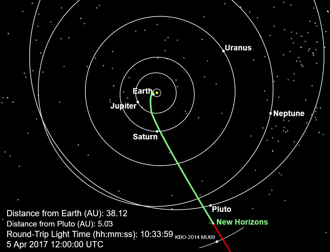 New Horizons è attualmente a 5.7 miliardi di chilometri dalla Terra; a quella distanza, un segnale radio inviato dal controllo di missione impiega circa cinque ore e 20 minuti raggiungere la nave spaziale. Al momento, dicono da Laurel, tutti i sistemi della sonda sono integri e funzionano normalmente, e il veicolo spaziale è perfettamente indirizzato verso il suo futuro party di capodanno.
