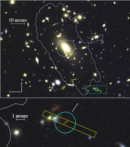La scoperta della galassia Macs1423-z7p64 è stata possibile grazie all’effetto di lente gravitazionale esercitato da un ammasso di galassie che si trova frapposto alla Terra ed esattamente allineato tra noi e la remota galassia. Questo fenomeno, predetto dalla teoria della relatività di Albert Einstein, ha amplificato la debolissima luce proveniente dalla galassia di ben dieci volte, rendendola così individuabile nelle riprese del telescopio spaziale Hubble. Il team è quindi riuscito a determinare la distanza della galassia analizzando la sua luce non lo spettrometro Mosfire installato al telescopio da 10 metri Keck I alle isole Hawaii.