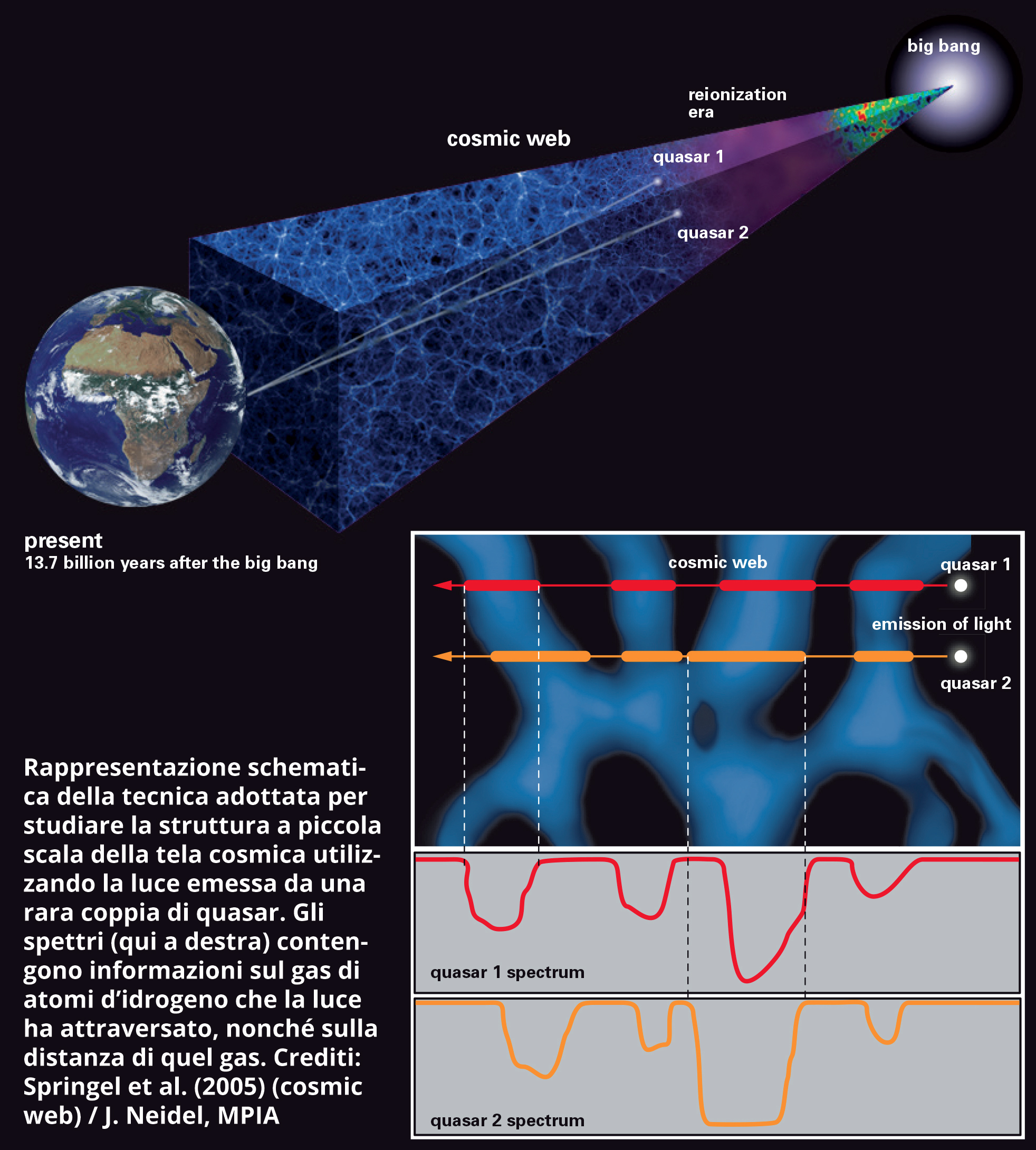 Luce proveniente da quasar: galassie remote con un buco nero supermassiccio nel cuore in fase di iperattività, e dunque di iperemissione luminosa. Perfetti per “retroilluminare” quel che c’è fra noi e loro. In questo caso, appunto, l’impalpabile tela cosmica che permea il mezzo intergalattico. Ma non quasar normali: ciò di cui Rorai e colleghi avevano bisogno erano coppie di quasar. Ora, proprio perché legati alla fase di iperattività, già i singoli quasar sono relativamente rari. Trovarli in coppia, poi… «È stato come cercare aghi in un pagliaio», ricorda uno dei coautori dello studio, Joseph Hennawi di Uc Santa Barbara (Stati Uniti), che per racimolarne a sufficienza ha dovuto sviluppare un metodo di machine learning. «Abbiamo passato al setaccio immagini astronomiche con miliardi di oggetti celesti, ognuno dei quali milioni di volte più tenue di quanto si possa vedere a occhio nudo». Dopo settimane di supercalcolo (un normale pc avrebbe impiegato mille anni), nella rete erano rimaste impigliate 25 coppie di quasar adatte allo scopo.