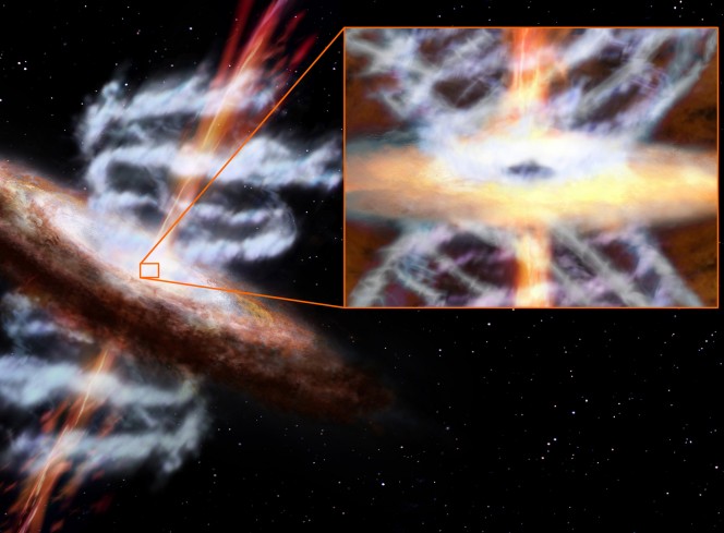Rappresentazione artistica di una galassia che sta rilasciando materiale sia attraverso due getti relativistici fortemente collimati (in rosso e arancio) e sia attraverso gli Ufo (in grigio e blu), flussi ultra-veloci con un’apertura angolare maggiore. Crediti: Esa/Aoes Medialab.