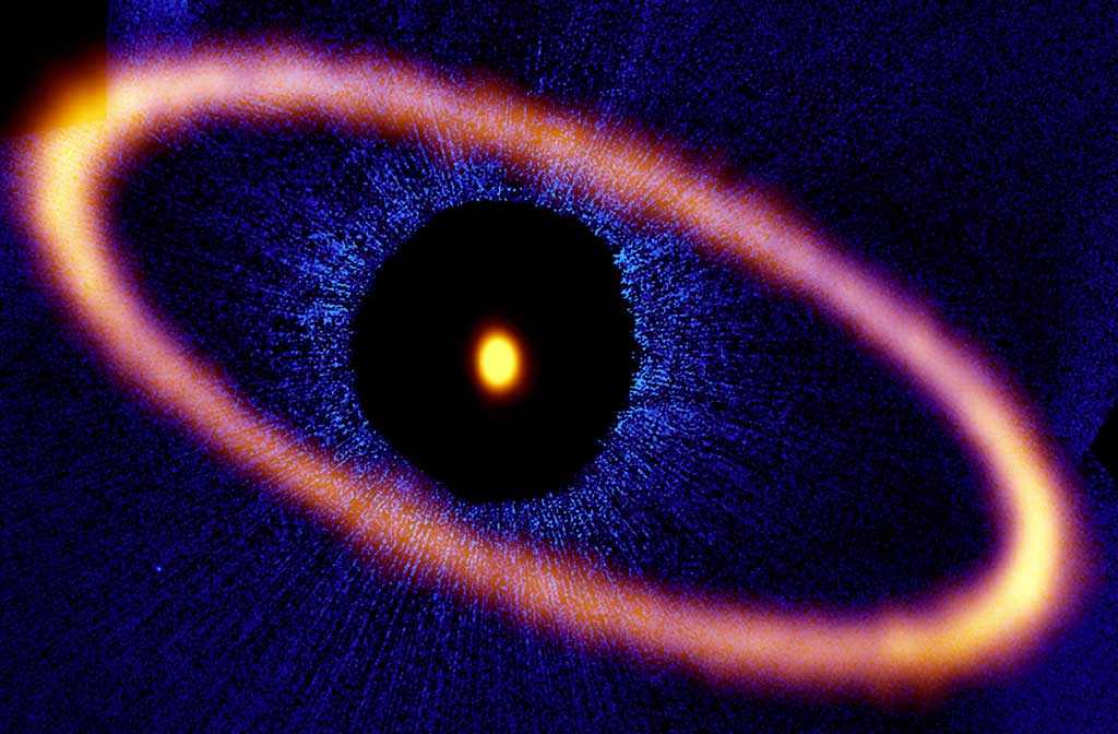 Immagine realizzata con Alma. Il disco attorno alla stella Fomalhaut si trova a circa 20 miliardi di chilometri dal centro del sistema ed è largo circa 2 miliardi di chilometri. Crediti: ALMA (ESO/NAOJ/NRAO); M. MacGregor