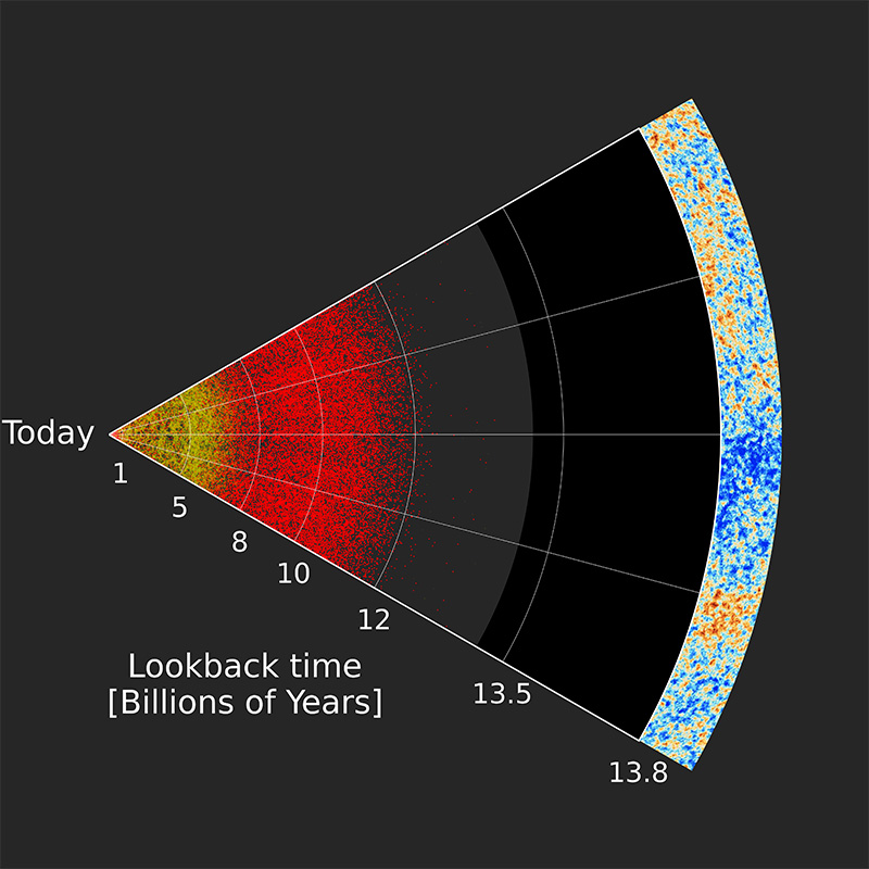 La figura illustra una fetta della più grande mappa tridimensionale dell’universo mai realizzata. La Terra è a sinistra e le distanze a cui si trovano galassie e quasar sono indicate dal tempo che occorre alla luce per propagarsi nello spazio prima di raggiungere i nostri strumenti. La posizione dei quasar è indicata da punti rossi mentre quella delle galassie più vicine, identificate dalla survey Sdss, è mostrata da punti gialli. Nella parte estrema, a destra, è rappresentato il limite dell’universo osservabile, da cui proviene la radiazione cosmica di fondo, la luce più antica. La parte in mezzo alla figura, cioè lo spazio vuoto tra i quasar e la parte estrema dell’universo osservabile, rappresenta la cosiddetta “età oscura” dell’universo, l’epoca che precede la formazione delle stelle e galassie. Crediti: Anand Raichoor (École polytechnique fédérale de Lausanne, Switzerland) e Sdss collaboration