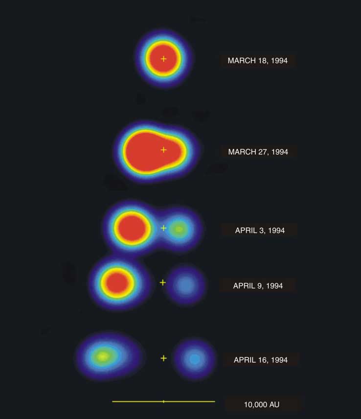 Il getto relativistico osservato nel 1992 dal buco nero stellare Grs 1915+105. Nel giro di un mese si vedono due “proiettili” espulsi dal buco nero (qui indicato con una croce). La velocità dei proiettili, osservati con il radiotelescopio Vla negli Usa, è il 29 per cento di quella della luce. Crediti: Nrao/Aui