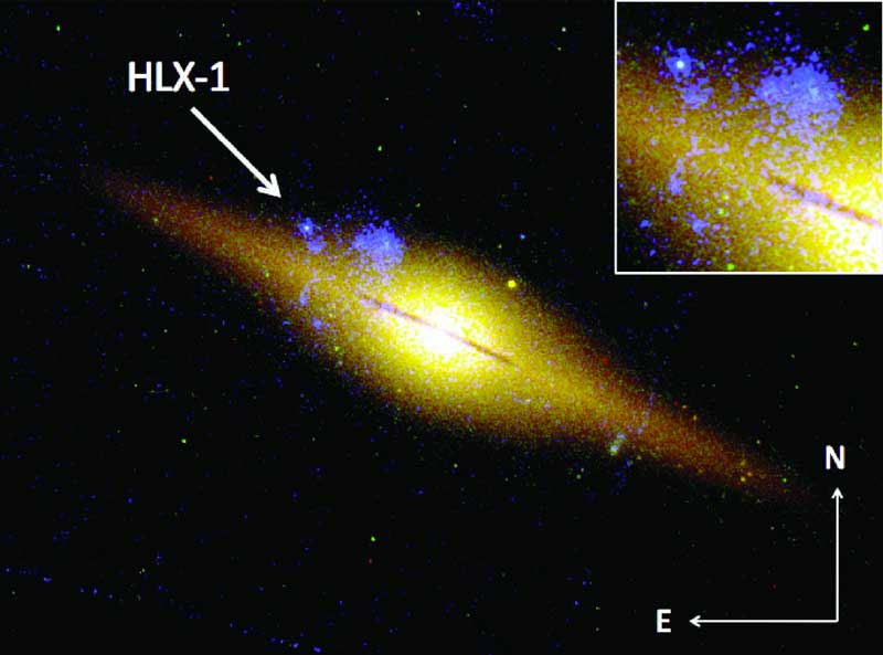 Immagine della galassia Eso 243-49 ottenuta utilizzando dati del telescopio spaziale Hubble. Lo zoom nel riquadro e la freccia mostrano la posizione della sorgente X HLX-1, che è uno dei principali candidati buco nero di massa intermedia. Fonte: Mnras 433, 849, M. Mapelli et al. (2013)