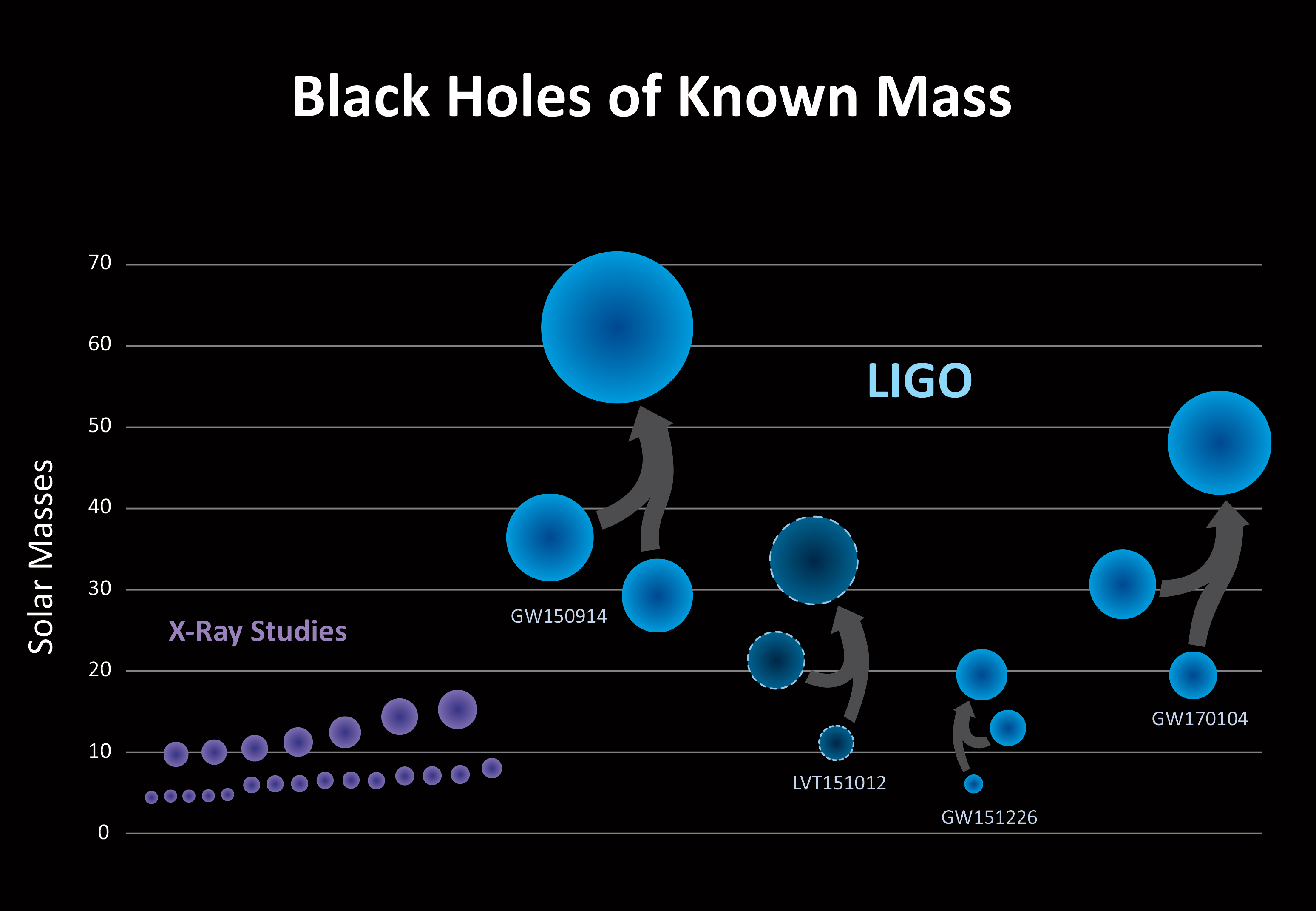 Le sorgenti gravitazionali identificate da Ligo rappresentano una nuova popolazione di buchi neri le cui masse sono decisamente più grandi rispetto a quelle che sono state ottenute con le sole osservazioni in banda X. Le tre sorgenti di onde gravitazionali confermate (Gw150914, Gw151226 e Gw170104), assieme a un’altra che ha un livello di significatività più basso (Lvt151012), suggeriscono l’esistenza di una popolazione di binarie di buchi neri di massa stellare che dopo il processo di fusione possono raggiungere 20 masse solari, un valore più grande rispetto a quanto si pensava prima. Crediti: Ligo / Caltech / Sonoma State (Aurore Simonnet)